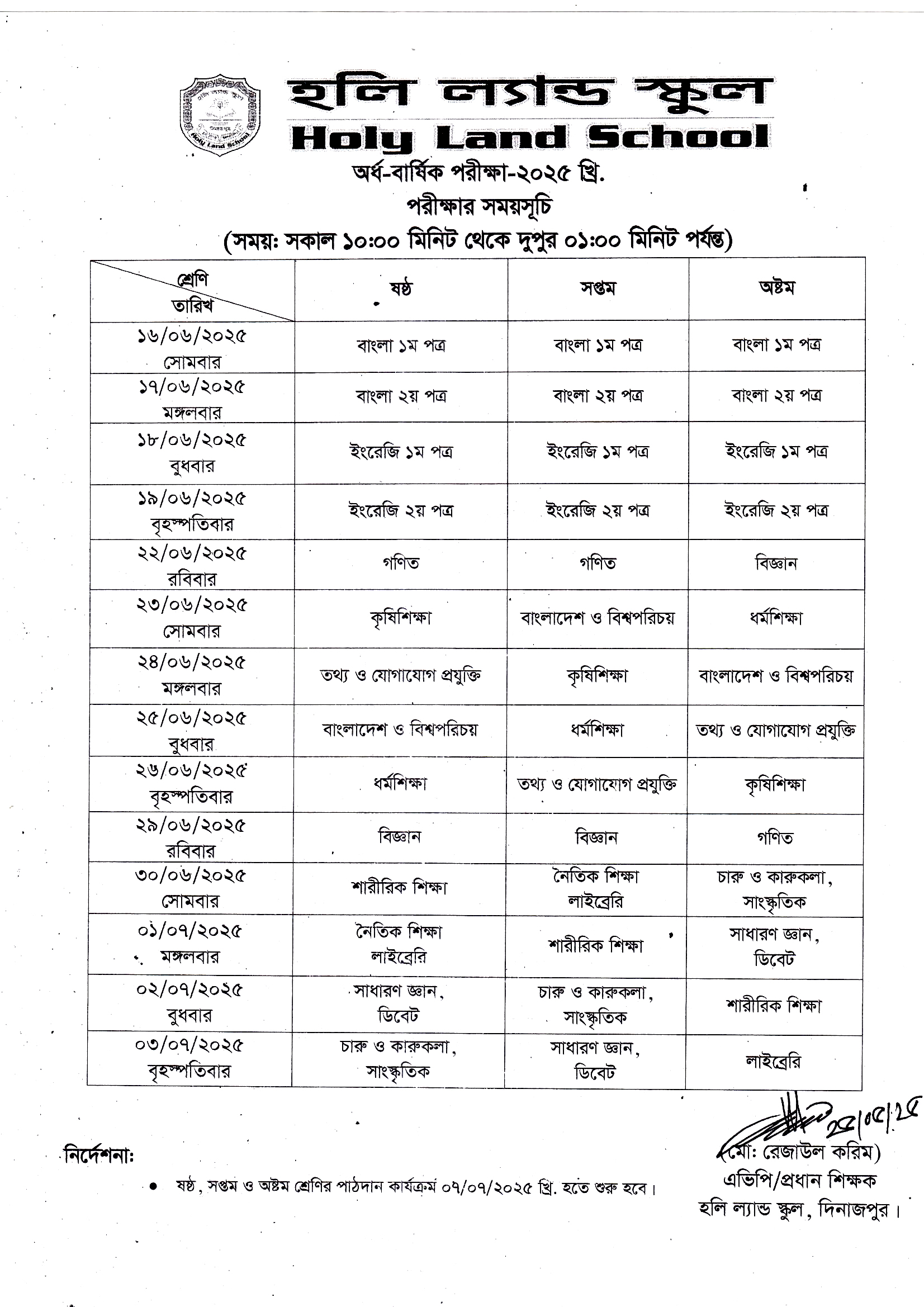 অর্ধ-বার্ষিক পরীক্ষার সময়সূচি - 2025