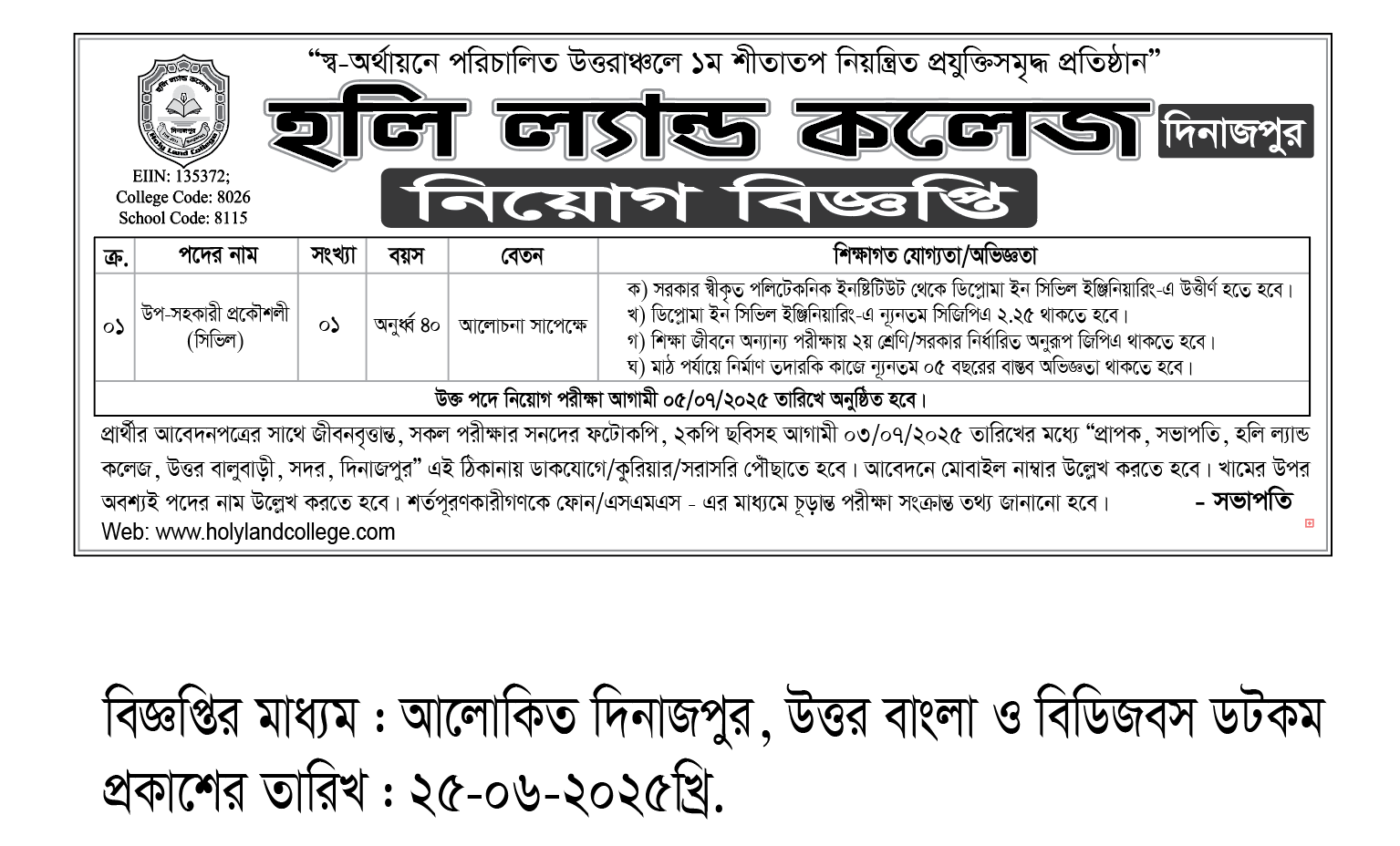 উপ-সহকারী প্রকৌশলী (সিভিল) পদে নিয়োগ বিজ্ঞপ্তি
