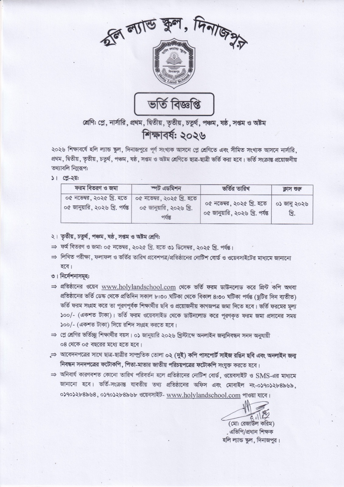 হলি ল্যান্ড স্কুলে প্লে গ্রুপ থেকে ৮ম শ্রেণিতে ( আবাসিক/অনাবাসিক) একাডেমিক কার্যক্রম চালু আছে...
