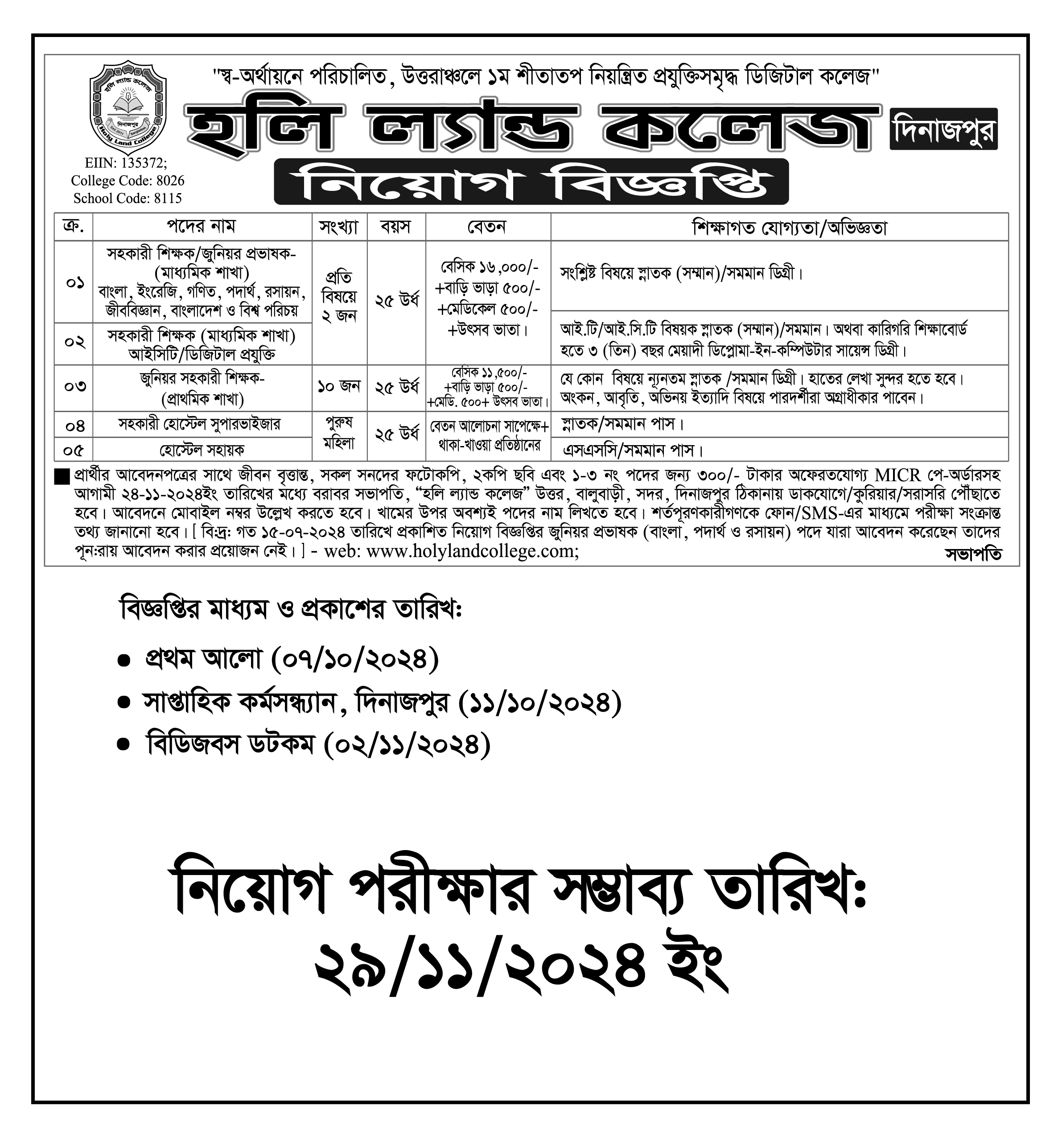 নিয়োগ বিজ্ঞপ্তি ০৭-১০-২০২৪ খ্রি.