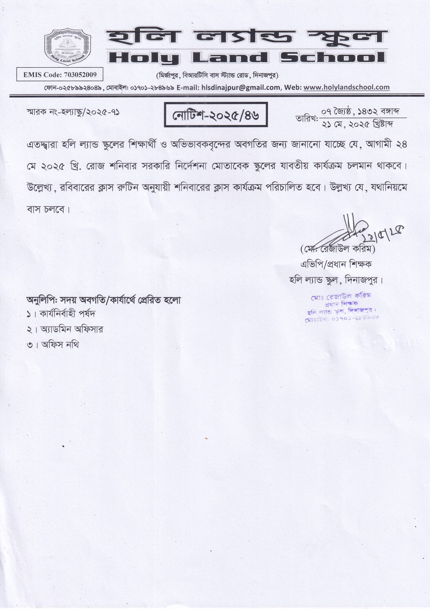 হলি ল্যান্ড স্কুলে প্লে গ্রুপ থেকে ৮ম শ্রেণিতে ( আবাসিক/অনাবাসিক) একাডেমিক কার্যক্রম চালু আছে...